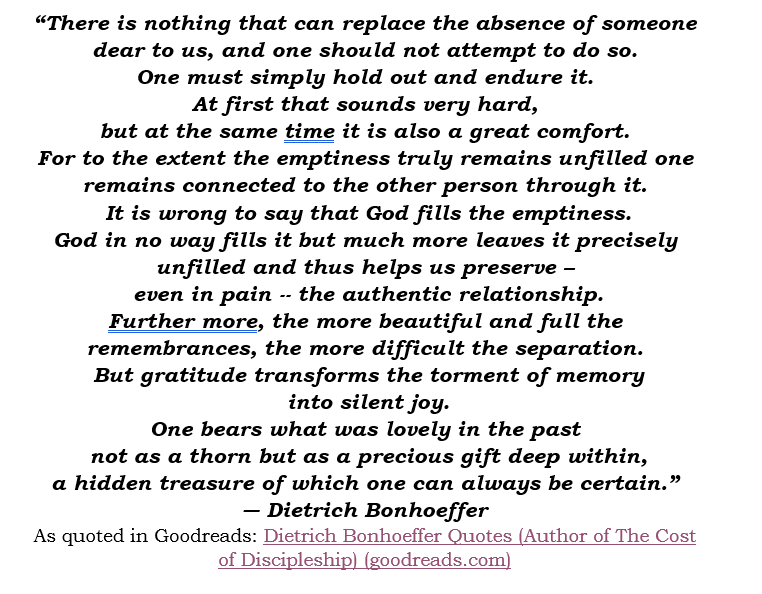 2. Hi Greg, I am sorry that we have not responded to your email asking about my brother’s experience and getting together to talk about this. Did I give you a copy of his book? If not, I have one for you. Our summer has been VERY busy and continues through October. If we could coordinate a date in November that would work to get together, we loved to meet with you. We should try to select a date before November gets away from us! I loved what you have written in this post. For someone whom has recently lost a love one, they will find helpful thoughts and ideas to help them in their journey. Would meeting on Fri., November 1 work to meet at 10 am at Bruegger’s on HWY 96 in North Oaks? If not, do you have a day and time that would work for you?