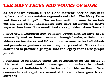 - The Hope Matters! Section will be replaced in the future with the section entitled: The Many Faces and Voices of Hope” which will include current and former individuals who have displayed hope in their lives and actions with individuals surrounding them.