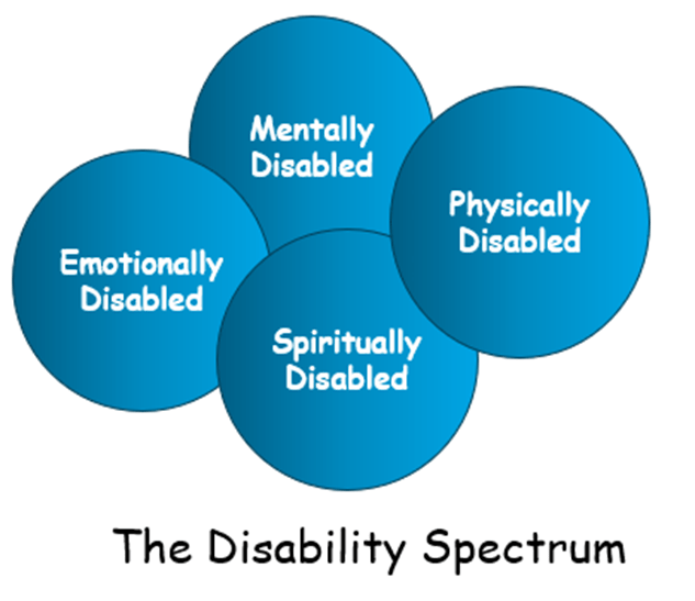 When we think about and discuss disabilities, we often limit our conversations both internally and with others to physical disabilities. But I would like to approach the subject of disabilities by utilizing the model I have used in the “Keys to Resilience” page on this website and expand this section to include not only physical disabilities, but also include spiritual, emotional, and intellectual / mental disabilities as well. In doing so, we can expand our discussion to include the whole individual.